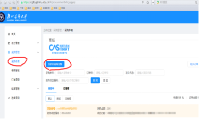 4、在菜单栏的“采购管理”中选择“采购申请”,之后点击“发起非商城采购”。