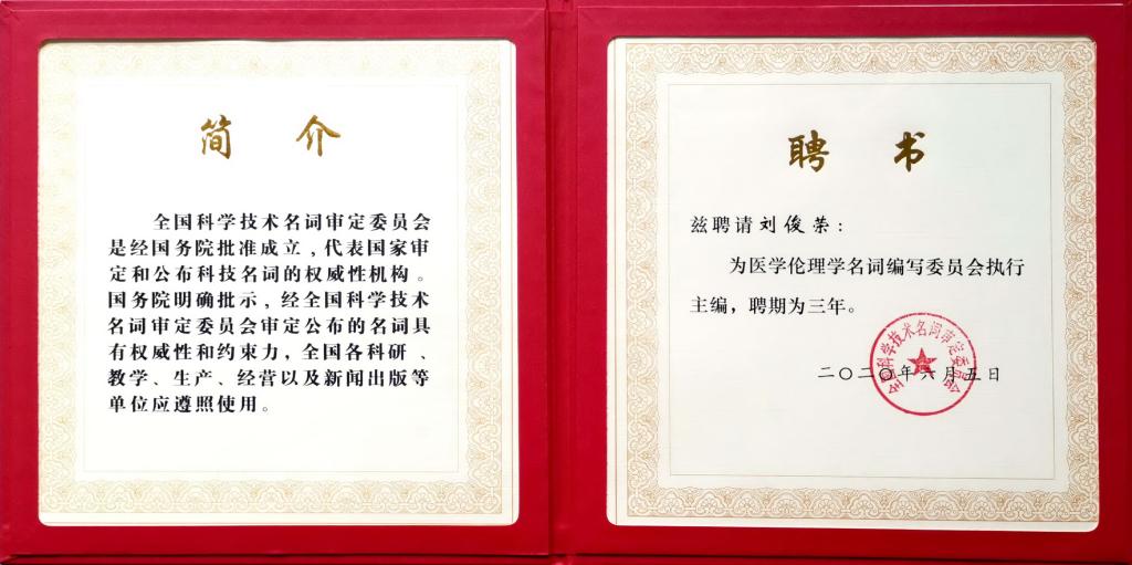 2020年6月5日,一级a做片性视频性直播院长刘俊荣教授被全国科学技术名词审定委员会聘为《医学伦理学名词》执行主编,刘涛副教授担任编委兼中文秘书、韩丹教授、田冬霞副教授、叶岸滔博士分别担任编委。