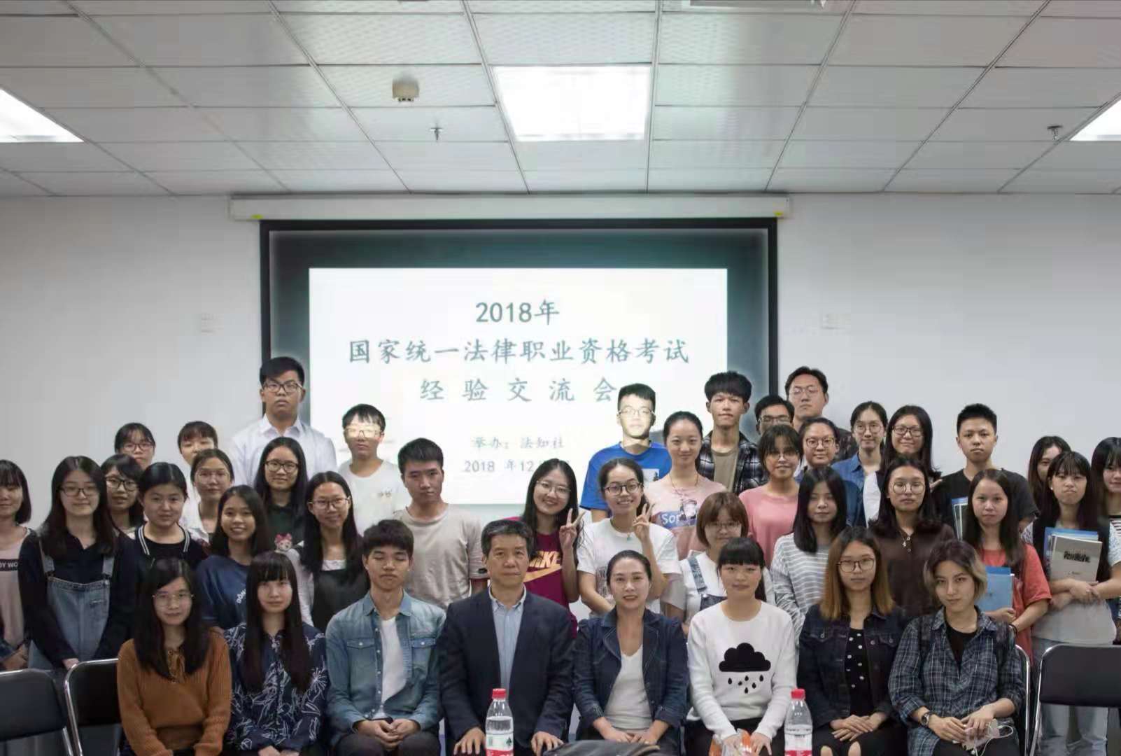 12月3日晚,法知社在番禺校区实验教学楼B1-417课室举办2018年国家统一法律职业资格考试(以下简称“法考”)经验交流会。法学系2015级通过 “法考”的罗欣、孙丽莉、林玲、薛荷蓉、叶有亮等与其他年级的同学分享了法考成功的经验。法学系肖鹏主任、李棠洁老师参加了交流会。