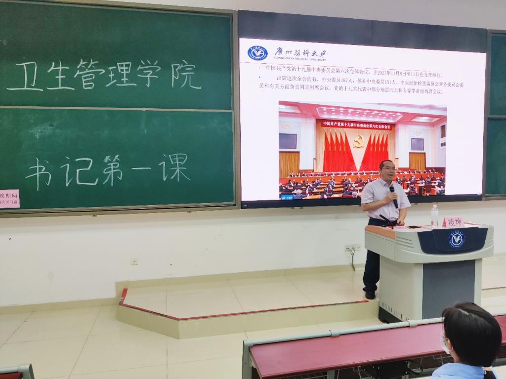 3月16日晚上,我院2022年春季学期“思政第一课”在番禺校区A3-101课室继续开讲。党总支书记凌坤以“学习贯彻党的十九届六中全会精神,致敬党的百年奋斗史”为主题给学院学生支部书记、全体学生党员、入党积极分子上了一堂生动的思政课。