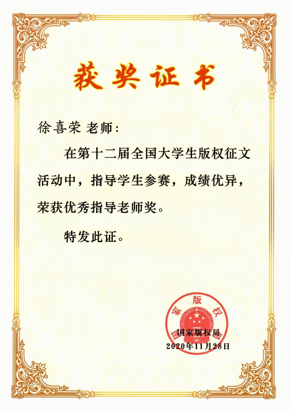 近日,由国家版权局主办,中国人民大学国家版权贸易基地承办的第十二届全国大学生版权征文比赛获奖名单出炉。由我院徐喜荣教授指导的法学专业学生在比赛中获二等奖和优秀奖各一项,其本人也再次获得优秀指导老师奖(全国仅20名)。