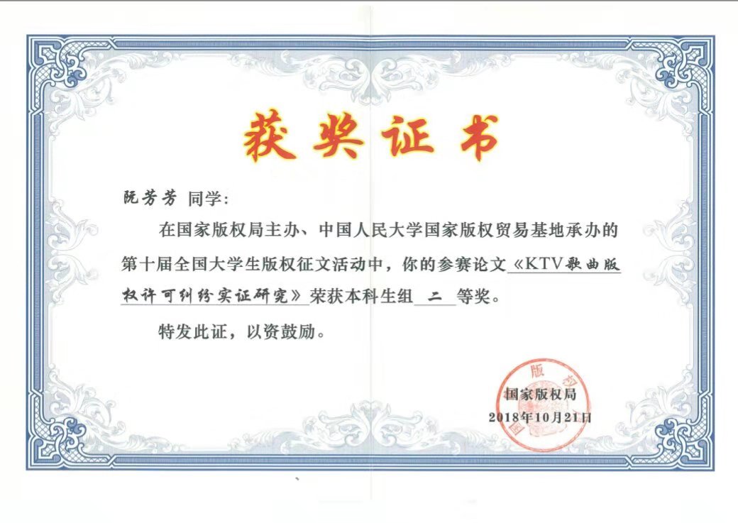 2018年10月21日,中华人民共和国国家版权局主办的第十届全国大学生版权征文活动获奖名单正式公布,在我院徐喜荣副教授的指导下,法学专业阮芳芳同学提交了题为《KTV歌曲版权许可纠纷实证研究》的论文,该文荣获本科生组优秀论文二等奖。获奖名单显示,广东仅有中山大学、华南师范大学、广州医科大学三所高校获得本科生组优秀论文奖,我校是广东高校中唯一获得本科组二等奖的高校,也是广东高校获得的本科生组优秀论文的最高奖项,其他两所高校均获得三等奖。