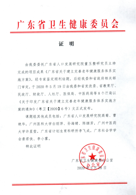 为贯彻落实国家卫生健康委等八部门联合印发的《关于建立完善老年健康服务体系的指导意见》(国卫老龄发〖2019〗61号)文件精神,切实将老年健康服务体系建设纳入我省经济社会发展相关规划,纳入深化医改和促进养老健康服务业发展的总体部署,广东省卫生健康委员会委托广东省人口发展研究院组建了由多个单位不同研究背景学者组成的课题组,开展“广东省关于建立完善老年健康服务体系实施方案”的政策研究,经专家鉴定顺利结题。