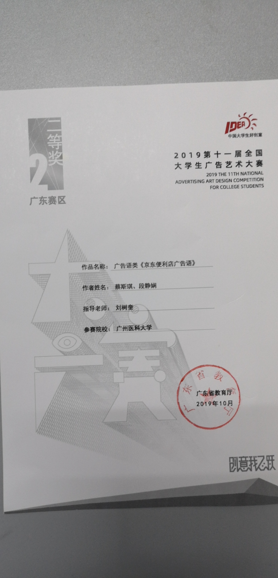 近期,我院市场营销系2016级学生蔡斯琪、段静娴团队在刘树奎教授的指导下,完成的广告创意作品获得第十一届全国大学生广告艺术大赛广东省赛区二等奖,这是卫生管理学院学生首次参加大学生广告艺术大赛并获奖。
