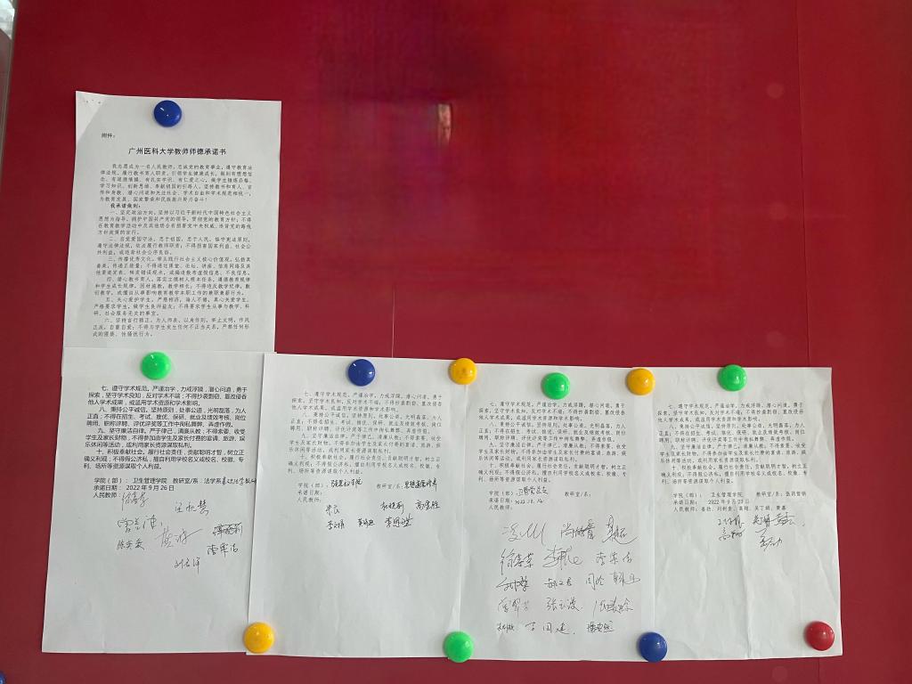 本次师德承诺书签字仪式,是卫管党总支根据学校人事处在全校范围开展签订师德承诺书的统一部署举行的,是学校师德建设主题教育月活动之一。签订后,卫管党总支将于2022年10月17号-24日在番禺校区B1-511室外宣传栏进行公示。