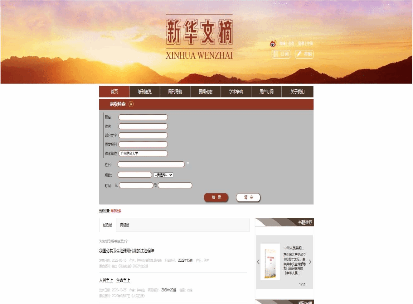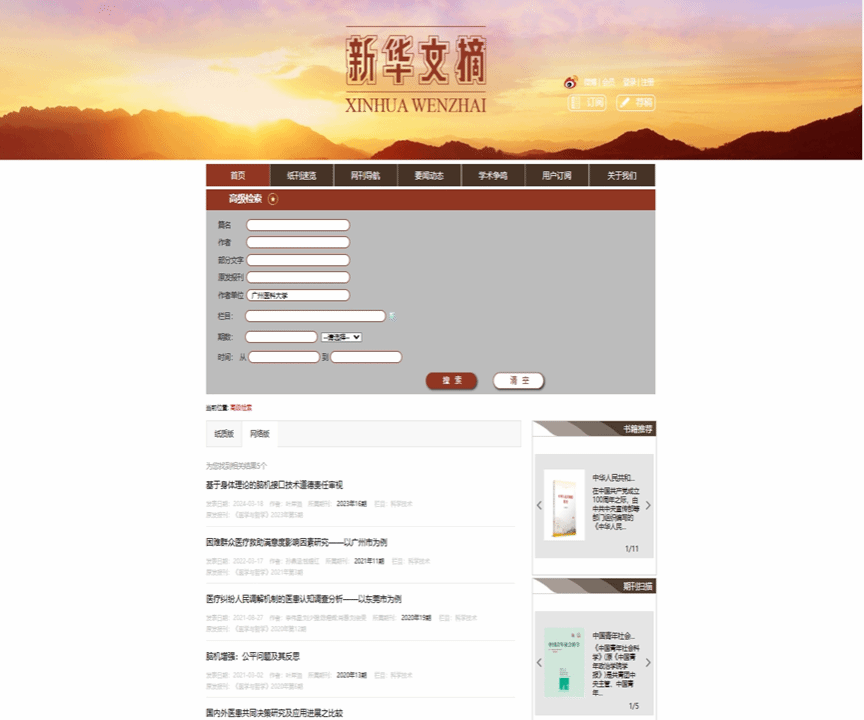 《新华文摘》(网络版)是由国家新闻出版署主管、人民出版社主办的在线性、综合性、学术性文摘半月刊,同《新华文摘》(纸质版)形式相同,主要刊载国内学术期刊登载的精品文章。《新华文摘》因其选登文章的学术性、权威性、思想性和可读性,成为我国学术界公认的权威学术期刊之一。