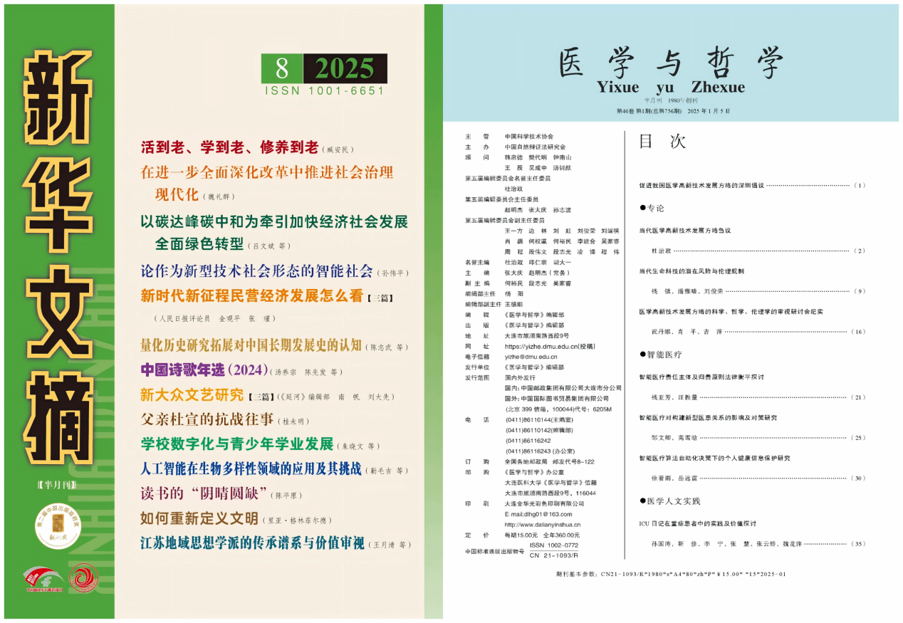 近日,我院刘俊荣教授团队在《医学与哲学》2025年第1期所撰论文《当代生命科技的潜在风险与伦理规制》被《新华文摘》2025年第8期论点摘编转载。